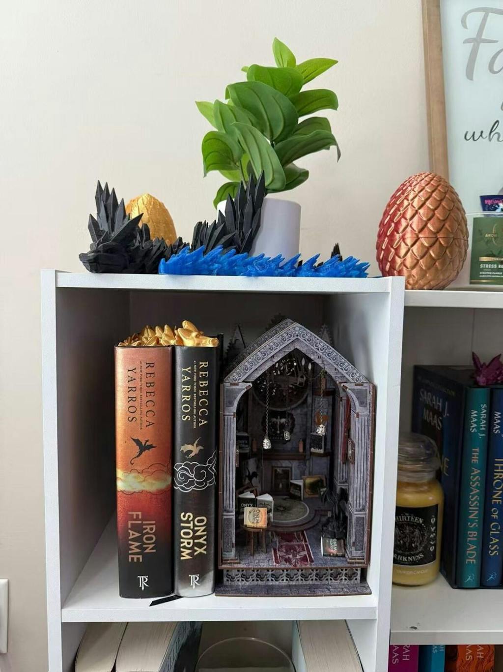 Inspired by the thrilling world of Fourth Wing by Rebecca Yarros, this handcrafted book nook brings Basgiath War College to life. Designed with a dark, gothic aesthetic, it features miniature Fourth Wing novels, a 3D-printed black dragon, and dragon-themed wall art to immerse you in the magic and danger of dragon riders.
