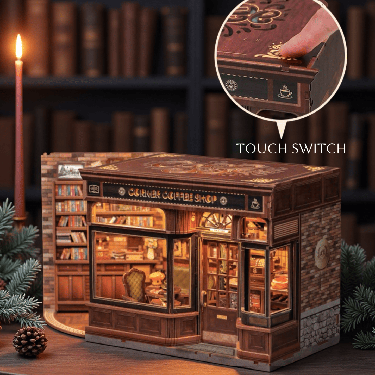 Close the book nook to showcase a quaint storefront, or open it to unveil a welcoming café inside—lined with bookshelves, plush seating, and a soft golden glow. It’s like discovering a hidden story waiting just behind the door.