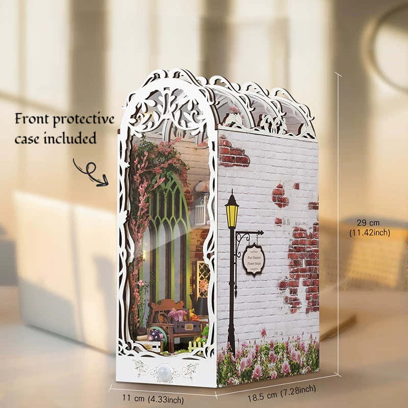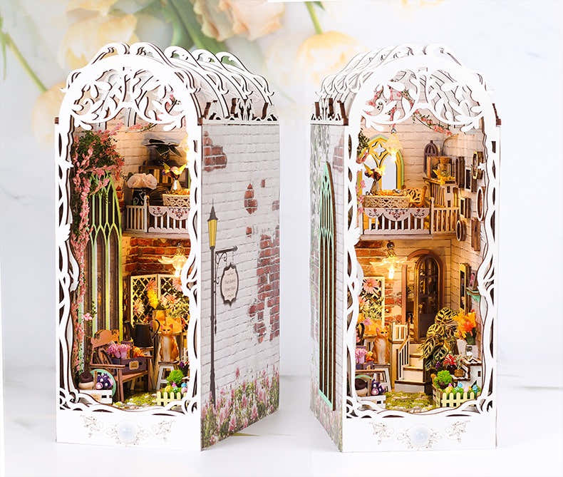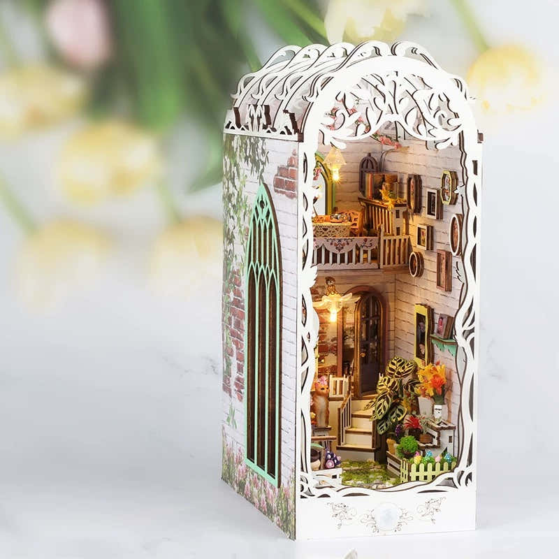 Design a peaceful garden retreat with a cozy reading nook, where transparent walls capture the soft glow of sunlight and the vibrant colors of blooming flowers. This enchanting miniature space brings the charm of a sun-filled garden to life.