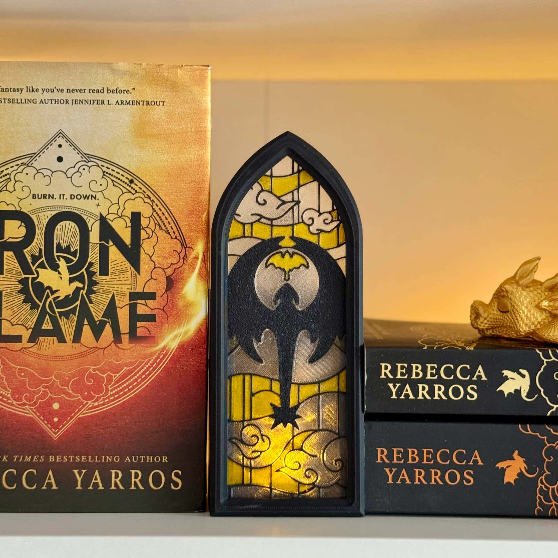 The Ember Sky Window captures the spirit of Fourth Wing — fierce, luminous, and born to defy gravity. Its stained-glass panels glow in hues of ember gold and stormy grey, evoking dragon wings slicing through the clouds at sunset.
