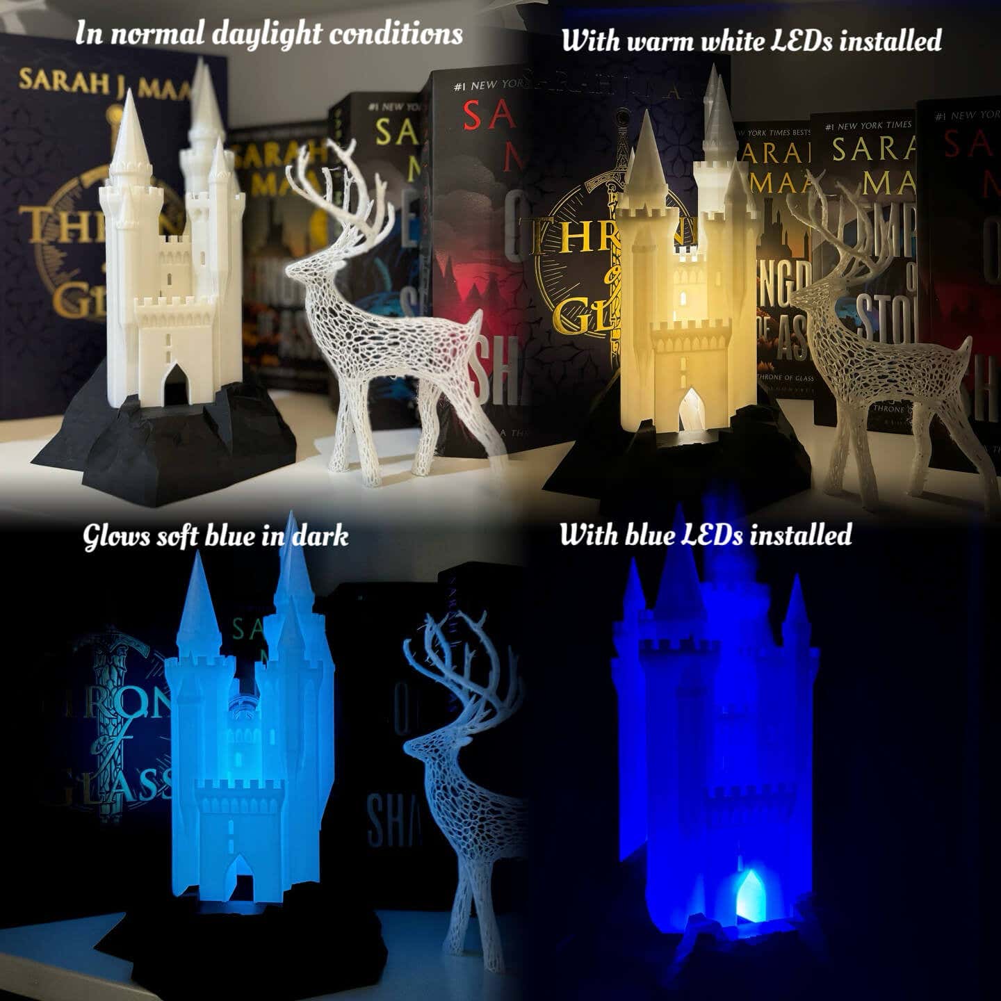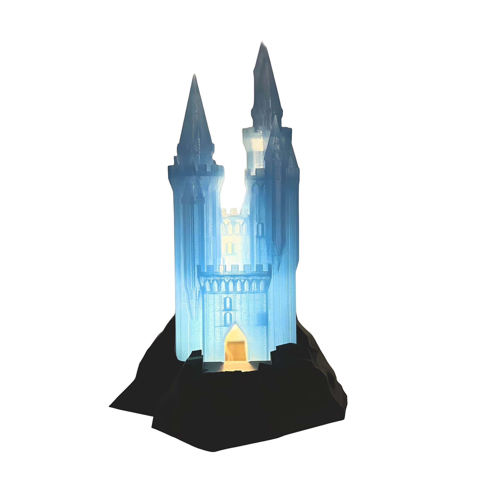 Crafted from shimmering translucent blue PLA, this Frostlight Edition Glass Castle is a tribute to the ethereal elegance of Rifthold’s palace. In daylight, it sparkles like frost under the sun. At night, the warm white or blue LED lighting brings its towers to life.