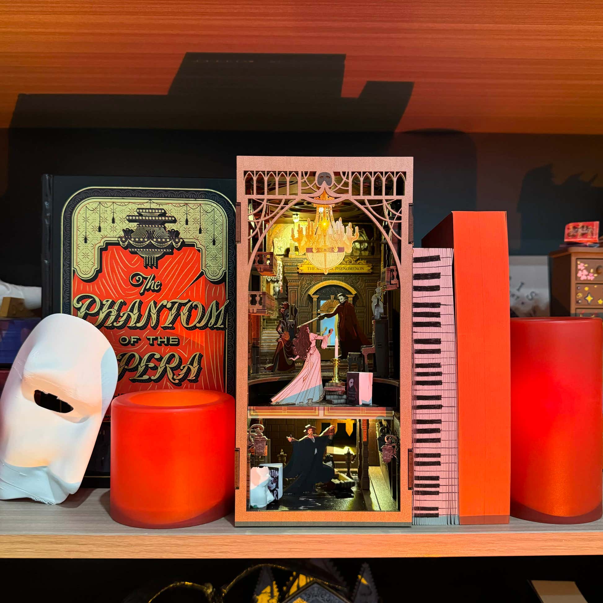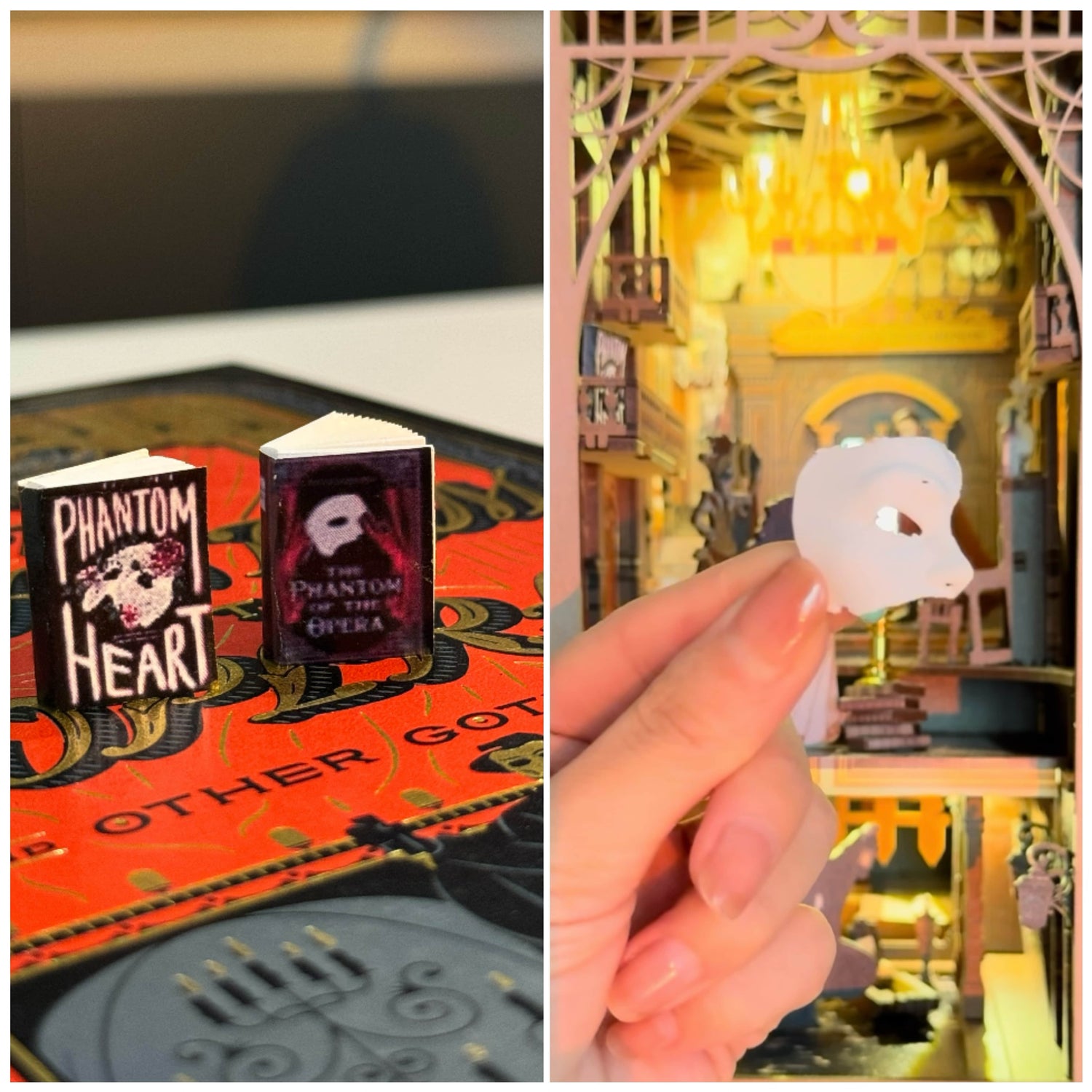 Each bookend set includes two tiny DIY mini-books—The Phantom of the Opera and Phantom Heart—plus an in-house printed mini-mask. Nestle them inside the bookend for a secret tableau, or let them stand alone among your books; either placement adds the final flourish to your Phantom shelf.