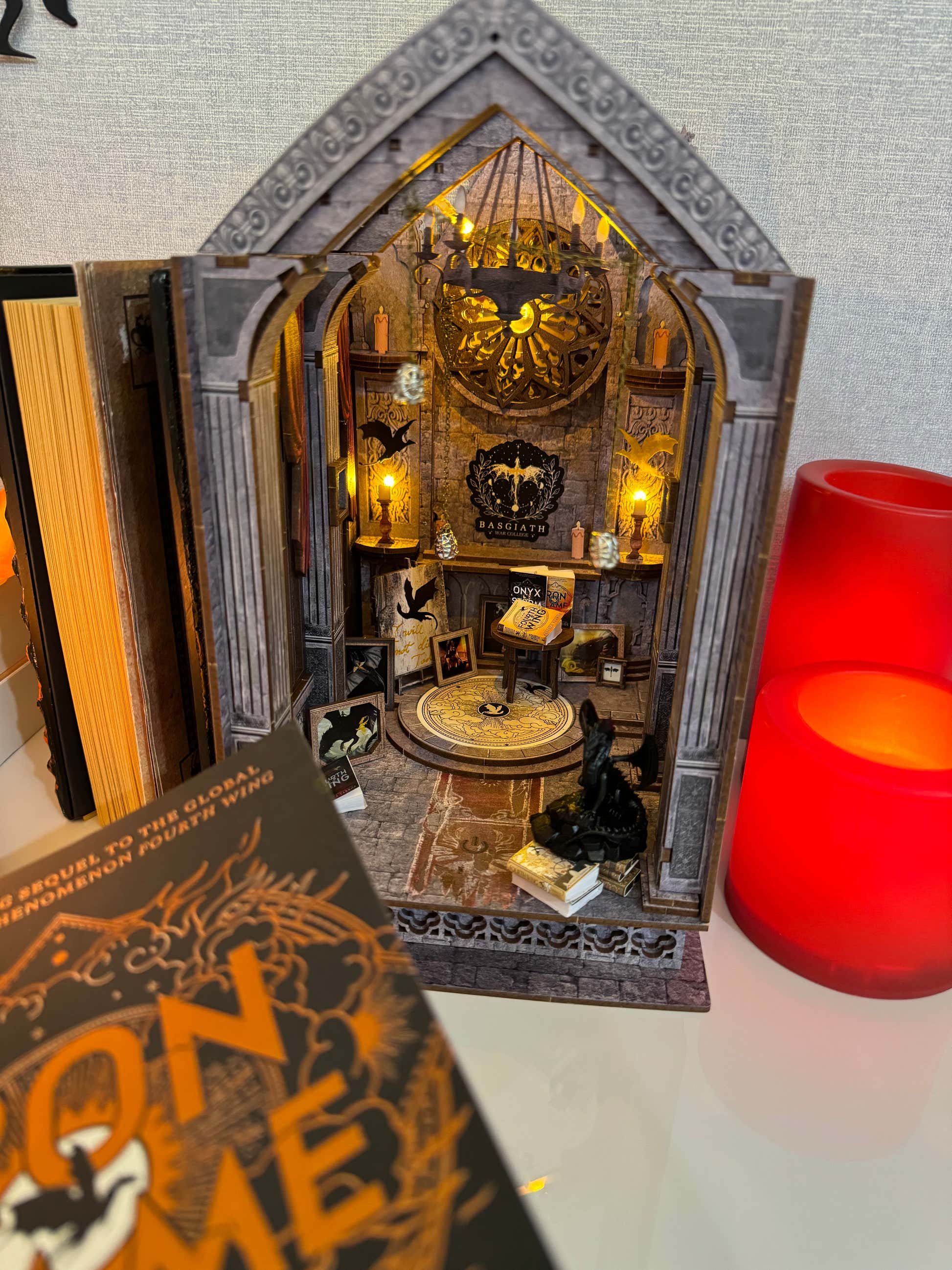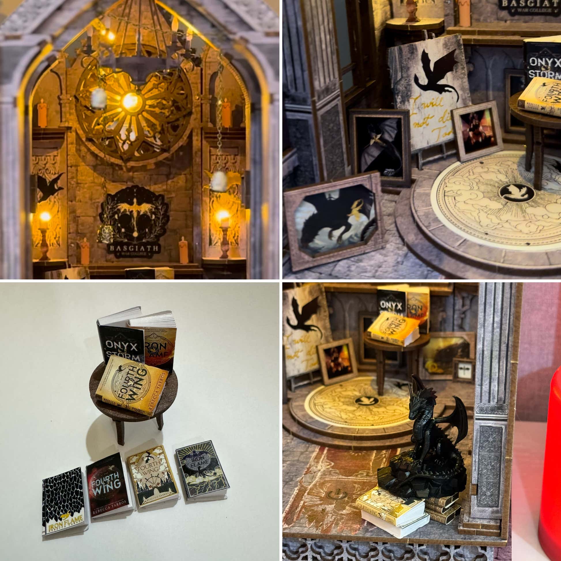 Inspired by the thrilling world of Fourth Wing by Rebecca Yarros, this handcrafted book nook brings Basgiath War College to life. Designed with a dark, gothic aesthetic, it features miniature Fourth Wing novels, a 3D-printed black dragon, and dragon-themed wall art to immerse you in the magic and danger of dragon riders.